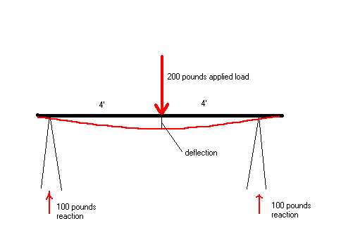 Next we sat a 200 pound fellow on a board that is 8' long and 1.5" thick and 3.5" wide and it deflected a certain amount like this...