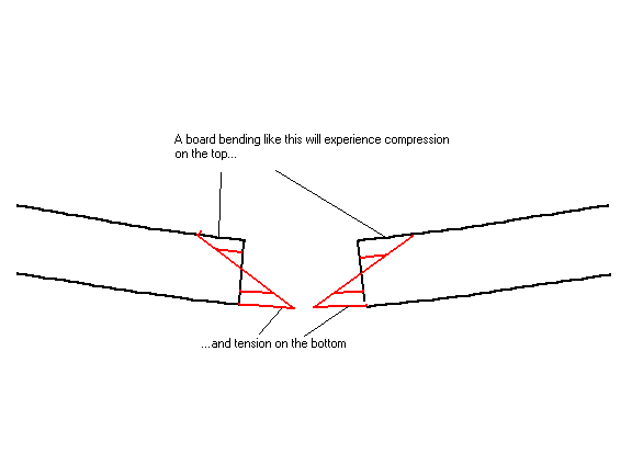 The board deflects in a curve of some sort but in order to do that the fibers on the upper side of the board must shorten and the fibers on the under side must elongate. The fibers inside the board will change length in proportion to their distance from the center or "neutral axis" of the board's cross section like this: