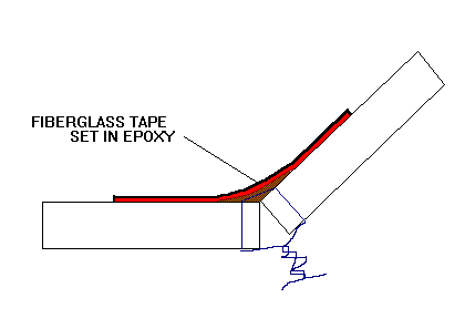 Then precut the fiberglass tape to length and lay the pieces out in a logical way so you can grab them quickly when needed. I always use 3" wide glass tape. It has no adhesive but is only called tape because of its form. It's edges are treated to prevent unravelling. When loaded with set resin the edges will be bulkier than the center of the tape, leaving a ridge. Some folks don't like the ridge. Some folks cut glass cloth into strips to avoid the ridge. I've tried that too to it unraveled and I ended up with a lot of glass hair flying around. I prefer the ridge which is easily ground down after the resin sets.