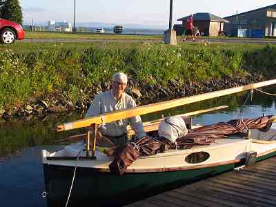Good job, Steve! But when you get to bigger waters be sure to row facing backwards, you can get a lot more power into it than with push rowing. With push rowing you can see what you are about to hit sooner, important on a two acre pond. I talked Steve out of fitting a motor which will never work well with a fine lined stern. Looks like I haven't talked him out of the sail rig yet. With no built in flotation Rogue, like any open traditional boat, will totally swamp in a capsize and you will need to be rescued, you won't be able to rescue yourself. LF Herreschoff in one of his books talks about this - with an open wooden boat that has been swamped you must bail it out before getting back inside by swimming beside as you bail. Then get in over the stern if you can. LF used the word "heartbreaking" as I recall since it was very iffy for anyone to try. If you want to sail, better to try Mixer or Piccup which are only slightly larger but have large buoyancy boxes that will permit self rescue.