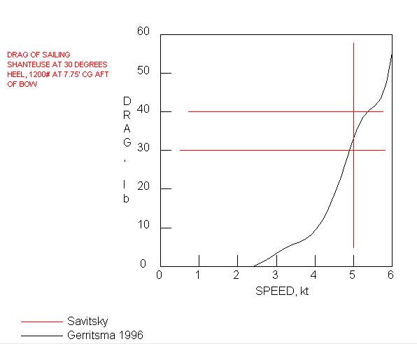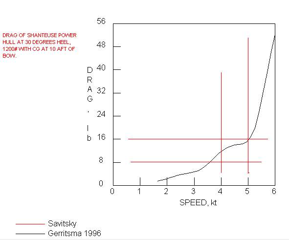 I was afraid of that. Only about 16 pounds drag at 5 knots, less again than the sailing hull. Well, I don't believe it. What else can I say. Still best to present this stuff even though I can't expain it. Must not forget that Hullform drag predictions have proven good in the past although I never tried the heeled drags.