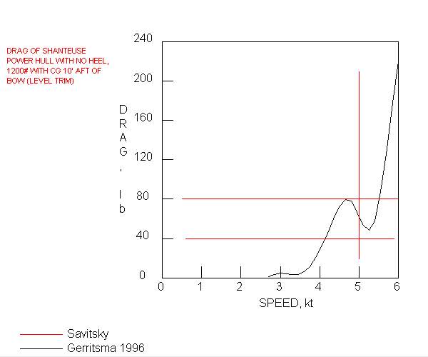 For the power hull it appears that at 5 knots the drag hovers around 60 pounds or so as long as the trim is not too extreme. For the most extreme trim shown drag jumps to say 340 pounds at 5 knots but I doubt if any serious boater would operate his craft that way.