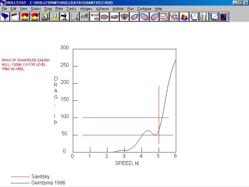 It occurred to me that Hullform might calculate drag of a hull that is heeled in sailing. Let's see if it will. Here is the drag prediction of the sailing hull with zero heel angle: