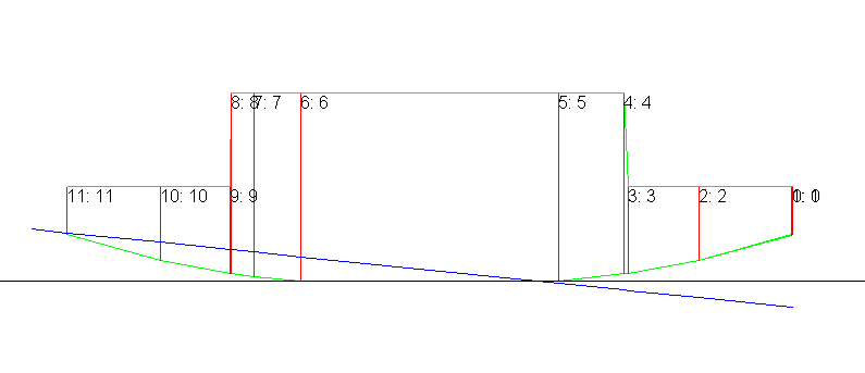 Now these is a difference. The sailing hull with cg at 11' has its transom just kissing the water, it is a very extreme trim but the transom is not immersed and the graphs show there is little effect in trim, something you would hope for with such a boat.