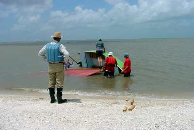 It's hard to tell, but the bottom drops off quickly here and the boat never touched. Sometimes it looks like it might be sitting on the bottom, but it was happily bobbing in the waves even when completely on it's side. It took a surprising bit of effort to pull the boat over even though it was entirely stripped of gear.