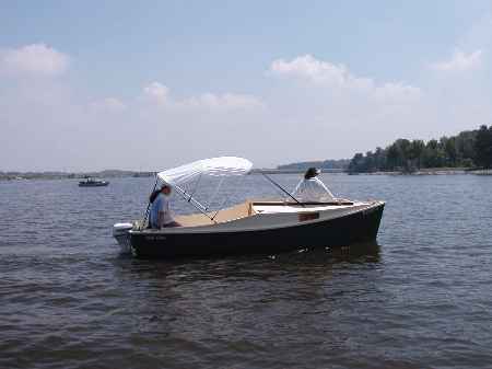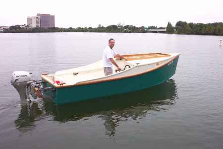 AF4 is a simple low powered cuddy cruiser intended for protected waters. Kilburn Adams of St. Louis brought a boat similar in spirit to AF4 to our Midwest Messabouts and it was easy to see what a good idea this is. Kiburn's boat was a modified Sturdee Amesbury power dory with a small cuddy added and a new 4 stroke Yamaha 10. He thought the empty boat weighed about 600 pounds ready to go. It planed quite well with two men on board at about 13 knots. He made a 60 mile trip on the Mississippi (above the Alton dam where the current is small) burning about 4 gallons of fuel. It's quiet and cheap to operate. It's a good idea now that smaller 4 stroke motors are more common.