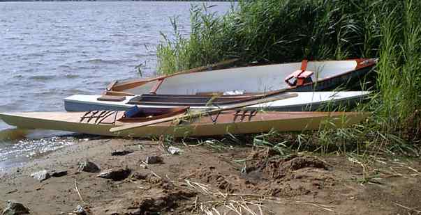Tom also brought his CLC kayak and there were quite a few smaller boats around. Max Wawrzniak brought these three, his Oracle, Larsboat, and a new kayak he built based on a Cape Charles design.