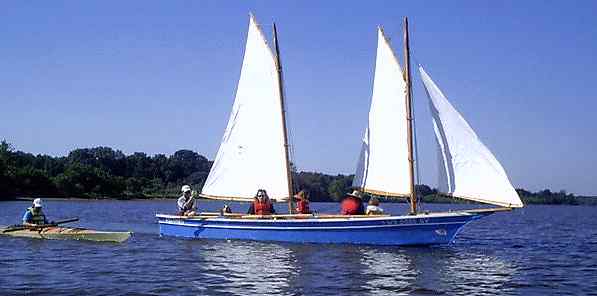 I suppose the biggest and most complex boat we have ever had here is this Bolger Scooner by Rob Rhode-Szudy, a man of endless energy and imagination. Third year here and all the bugs are worked out. Let's see what have we here - Rob and wife and two daughters and big dog and Chuck "duckworksmagazine" Leinweber at the wheel. Chuck and Sandra were here from south Texas again only this time on the tail end of a business trip, so they had Volkswagon and no boat of their own (and I should tell you one of the best ways to enjoy a messabout is to not bring a boat).