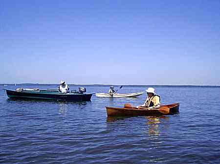 Also out on those glassy waters was Paul Hayne in a production Angler kayak and Rovie Alford in a Grumman canoe with motor and training wheels. They are also messabout veterans.