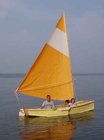 I've kept the sharpie sprit sail that might have been found on a traditional skiff 100 years ago. It requires no store bought fittings to work well and its simplicity means it will work well most of the time. Its only real drawback is the 16' mast it requires. Unlike the traditional boats, I have used my favorite pivoting leeboard and kickup rudder so you can sail in shallows with no fear. And this boat has buoyancy/storage boxes fore and aft to allow self rescue of a capsized boat. By the way, to reboard a boat like this after capsize you usally need to scoop some water out of the cockpit before trying to climb back into the boat, and you usally must reboard over the stern. These boats are often too light to accept the weight of a man trying to climb over the side without capsizing again. The bailing is needed to rid the boat of water sloshing from side to side causing an uncontolled roll that might lead to another capsize.