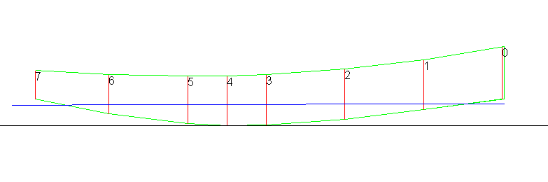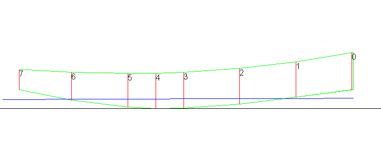 Now, Mayfly12 will probably weigh about 120 pounds, could be as light as say 80 pounds if it were made for rowing only. Add two adults to bring it up to 470 pounds total and place them such that she trims level (cg 6.5' from the bow) and Hullform says she will float like this: