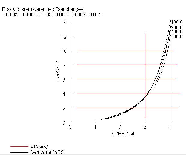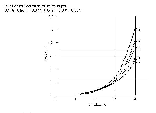 Now to run the Hullform drag predictions. Using the 6.5' cg location it made this graph showing drag at different weights up to 600 pounds total: