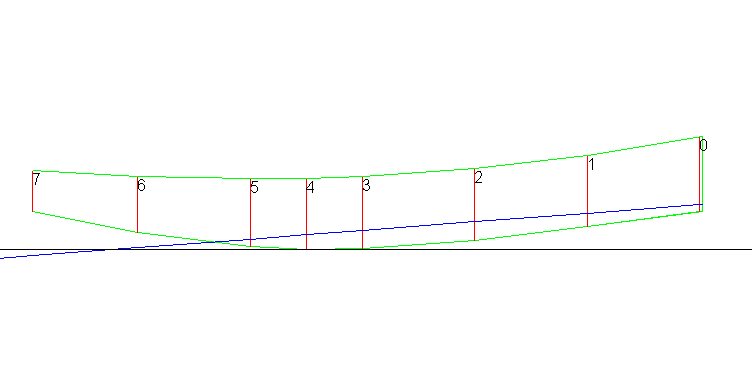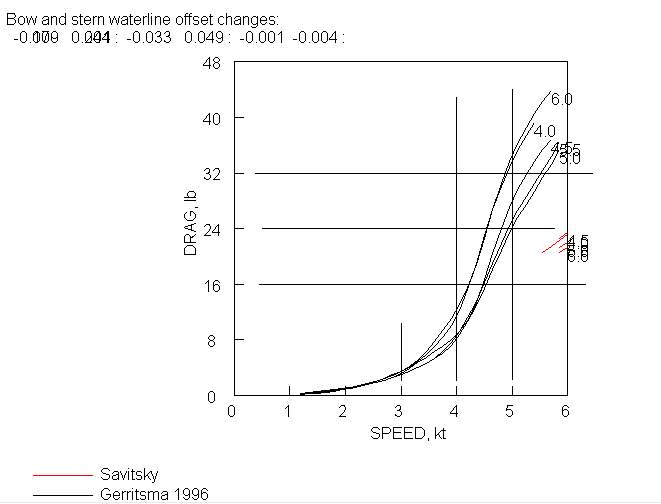 It says bow down all the way until it just touches the water. Stern way up. The program recognizes that at cg = 5 the bow is starting to push serious water and note that drag goes way up again at a cg =4. Do I really believe this? Haven't caught Hullform lying yet. And I do have something of a data point. I have been sailing my Birdwatcher for almost two decades now and it was clear from the start that you could have a grand time with it by getting into the big open lake, tying off the tiller so it would self steer well, then walk forward and sit in the forward most position of the top slot. That is way in the bow. The bow goes well down from your weight, the stern comes up, and the boat does not slow down.