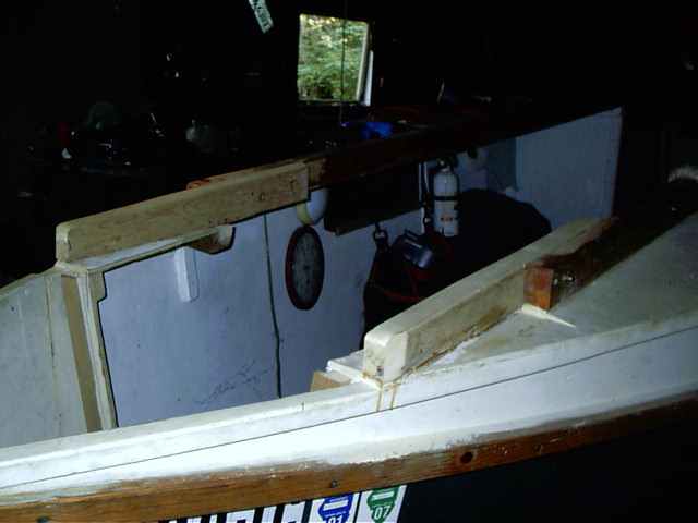 I had been thinking about ways to make it easier to board for a long time. When I'm healthy I usually sit on the little bow deck and swing my legs around into the deck slot. Then it is 3' down inside to the bottom. Egress is the reverse. Normally not a huge deal but a sore back would make you think twice about it and maybe you would decide on a different hobby for a while. I suppose I've been cruel since it was clear my wife had no interest in that leap of faith from the start. Anyway, as the boat sat in the shed over the summer I pondered an easier way to get aboard. Then one day I grabbed saw and started hacking. "If I'm going to ruin the thing with a new boarding idea I'd better do it now before getting involved with a new bottom," I told myself.