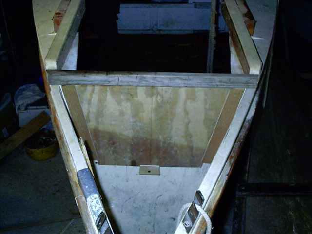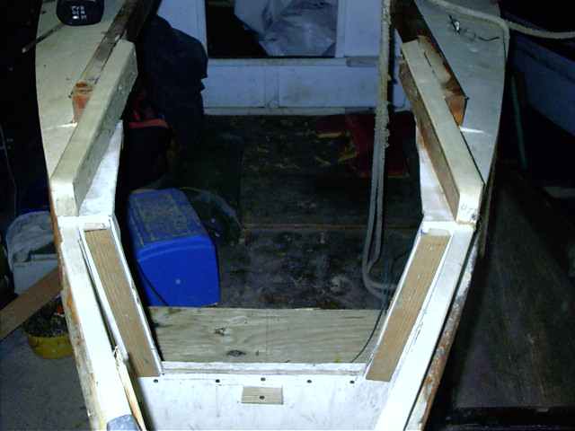 ..., not all of it of course. In AF4 the volume in front of this bulkhead is free to flood and has drain holes in the bottom. So that pointy bow is really a fairing, the real boat starts at the bulkhead. I whacked it down so that it was 20" from bottom to the new top and that should be plenty of freeboard there. So the new step through is about 12" lower than the old. I made a drop board from some scrap plywood to fill the new hole. So far so good.