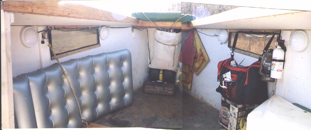 The 20% enlargement idea went very well except that I had to deepen the hull more than that to give some serious headroom in the cabin, but it doesn't have standing headroom. Great empasis was placed on ease of use and rigging. The main mast is short and stepped in a tabernacle. There is a draining anchor well in the bow, a small storage segment under the front deck. The mast tabernacle is bolted to the bulkhead that forms the front of the sleeping cabin. There is a utility room aft of the sleeping room. Water ballast tanks are under the bunks and in the sides of the utility room floor, about 600 pounds of ballast as I recall. Aft of the cabin is the self draining raised cockpit with storage volume under the deck. Finally there is a self draining motor well across the stern. Construction is taped seam plywood.