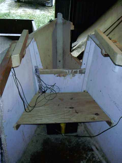 ...that would do double duty as a shelf and as a step. This was placed about halfway between bottom and the new bulkhead opening, about 12" off the floor. So now a fellow could step up 12" to the platform and then up another small bit to the edge of the new opening, a huge improvement over the 3' leap of faith. Here is a photo of the old setup: