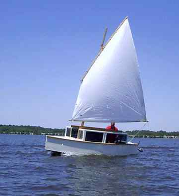 Update, 2007. Chris Feller completed his Philsboat, probably the first prototype completed, and brought it to the 2007 Rend Lake Messabout. Very well made and to plans except he used the 91 sq ft lugsail he had on hand for his AF3, with some mast rake changes he calculated with his "sail area math". Sailed correctly rigtht off the drawing board, so to speak. We had a chance to use it for a few really nice days. In a good sailing breeze, say 10 to 15 knots with occasional whitecaps, our gps bobbed between 5.5 and 6mph for two hours of reaching as we crossed back and forth on the big lake. When I used the Philsboat I thought it was probably just as easy to enter from a beach as the blunt bowed Scram. The front deck is about 2' high so you can sit on it and swing you legs around onto the deck and then into the cabin.