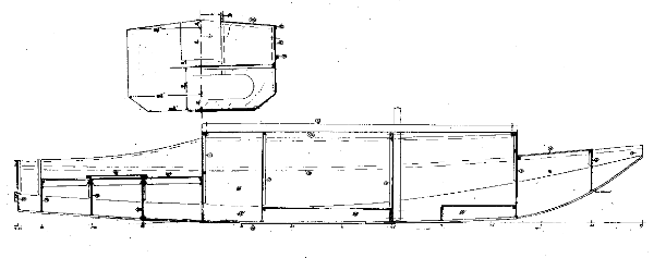 Constuction is taped seam, with no jigs or lofting. Unlike smaller designs this one does not come with a plywood panel layout drawing. Over the years I've learned two things about the ply layout page. First is that almost no one uses it. Second is that with a larger boat the work of finding and drawing and fitting all the pieces to the boat on scale plywood sheets overwhelms all the other work. So part of the deal with doing the design was that there would be no plywood layout drawing. However this is still a true "instant boat" in that all of the parts that define the boat are drawn in detail and you can scale them up on plywood, cut it out and fasten together with no need for lofting or a building form.