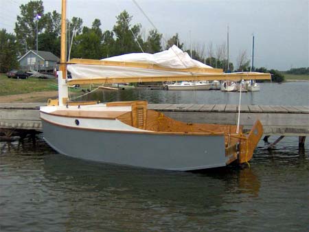The sail rig is a balanced lug which is easy to build and stow. I recommend that my customers sew their own sails either from common polytarp (as Garth did in the boat shown above) or real Dacron sailcloth. The plans show instructions for sewing in real sailcloth. You need a sewing machine that sews zigzag stitches and cheap home machines are usually good at that. I don't claim to be the world's best sailmaker but it is not majic. I can do it and so can you. The clothes you are wearing are ten times more complex than a small sail. There are a few rules to follow and I give an essay on that with each set of sailboat plans. In fact I suggest you sew your sails before you build your hull. Both sail and hull require about the same work space. Sew the sail first, roll it up, stuff it in a closet, and now your workspace is ready for your hull. Getting the sail done can get you over a big mental hurdle.