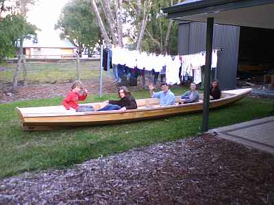 This is Ted Arkey's Jukebox2 down in Sydney. Shown with the "ketchooner" rig, featuring his own polytarp sails, that is shown on the plans. Should have a sailing report soon.