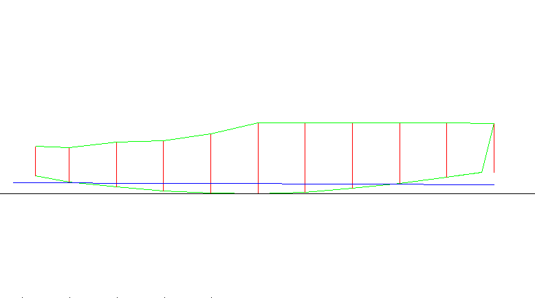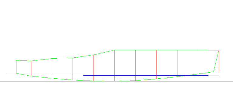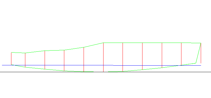Now that is a minimum weight boat in the water. Add a skipper and some of his junk and let's say the boat is sailing at 1000 pounds most of the time. Using our old friend Hullform we would expect a waterline like this: