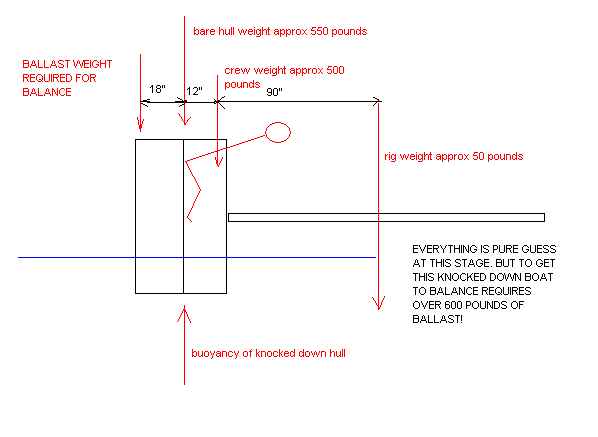 OK, next step is to figure the ballast needed to make it self righting and if you want to start a big argument just try to define "self righting". To me with a boat to be sailed close to shore where huge waves won't lurk and where rescue is possible I think it might mean it would return upright from a 90 degree tilt. To Howard Chapelle self righting for a sharpie was to return from just a 45 degree tilt. To an ocean sailor, who could get rolled by a big wave, it can mean righting from way past horizontal, say to 140 degrees. I don't know if any boat with inside ballast could do that.