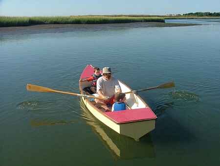 And the Vole in New York is Garth Batista's of www.breakawaybooks.com, printer of my book and Max's book and many other fine sports books. Boat is done, shown here off Cape Cod with mothership Cormorant in background, Garth's girls are one year older. Beautiful job! I think Garth is using a small lug rig for sail, not the sharpie sprit sail shown on the plans, so I will continue to carry the design as a prototype boat.