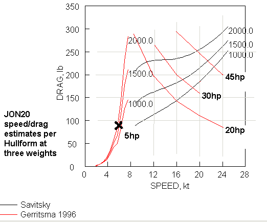 So when you look at at drag/speed curve from Hullform you are in a general way looking at a horsepower chart. At least by going through all the apples to oranges conversions you can pick a point of the Hullform curve and say it takes X horsepower to get there. But remember that X horse power on that curve is thrust at the prop, and to get X delivered by the prop you need a powerhead that puts out about 3X. So, with that behind us, here is the Hullform guess and the Jon20 drag/speed chart: