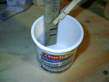 Anyway, you see the stick clamped to the side of the tub with a clothespin. The stick is marked 1-1/2" up from the bottom and again 3/4" above that mark. Fill with epoxy resin to the first mark and then to the second with hardener and there you have an accurate 2to1 mix. Of course if you have a hardener requiring a different ratio you set you top mark to suit. If you need more epoxy than shown you use deeper marks but it will be fine as long as the proper ratio is maintained. I know they sell fancy pumps for this but by my experience they are not totally reliable, especially with cold and thick epoxy.