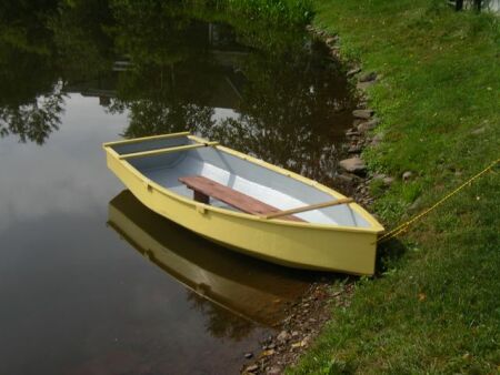 A successful launch. My daughter and son-in-law just bought a farm and this will be perfect for the 2 acre pond. As you can see I put in the Bolger seat. So far it seems to work well enabling me to easily change rowing positions to maintain balance etc. You can't see it in the photos but I inadvertently installed the keelson vertically so it's 3/4" deeper than spec but doesn't seem to make a difference. I've scratched the idea of a motor but would like to try a sail. Suggestions as to mast placement, leeboard etc would be appreciated. I have aluminum for a mast and bamboo for spars. In all of the above I forgot to mention that it's very east to row and I found that 6' oars work a bit better for me than the 7s. A quick and easy build of a fun boat.