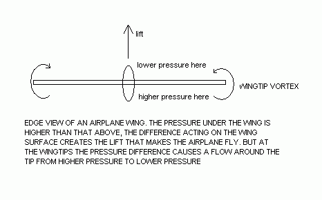 This is an airplane viewed head on. The thing flies because the air pressure acting on the underside of the wing is higher than that on the top. But in real life the air near the tip will try to escape from the bottom to the top by flowing around the tip, being pushed by the difference in pressure there. It swirls from bottom to top as the plane flies forward making a vortex. You can see them under certain conditions as they cause swirling clouds to appear at the wingtip.