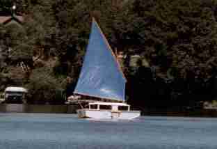 This is Ted Arkey's Jukebox2 down in Sydney. Shown with the "ketchooner" rig, featuring his own polytarp sails, that is shown on the plans. Should have a sailing report soon.