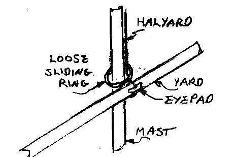 We need to rig the halyard so the sail stays near that 40% position by binding it somehow to the mast. This is especially important while reefed or while in rough water that will force the yard to pump back and forth on the mast. I know of three suggestions.