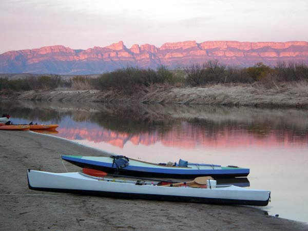 The 80 mile Rio Grande trip was magnificent! Imresboat made it possible. Here the Sierra Del Carmen mountains in Old Mexico glow in the sunset. Skip Johnson's boat is in the foreground-more about that later.