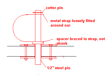 What we have here is simply two metal plates bolted to the wale with the proper sized hole (usually 1/2") drilled in each. Phil had his made of stainless steel. I made mine out of aluminum and have had no problems. I used an aluminum yardstick of the type carried by lumberyards for use with drywall as the basic material. I think the metal is about 1/10" thick and about 1-1/8" wide. I cut the aluminum to 3" lengths, stacked them up and drilled the oarlock hole and the bolt holes all at the same time. Filed off any sharp edges. Clamped the plates in the proper position and drilled the wooden wale. Bolted the plates in position and that's it. These work well because the oarlock bears on the metal parts which are about 1" apart, a bit more than the usual shallow factory sockets. So far I haven't worn them out. By the way, it helps to grease any oarlock from time to time, ordinary Vasoline works well.