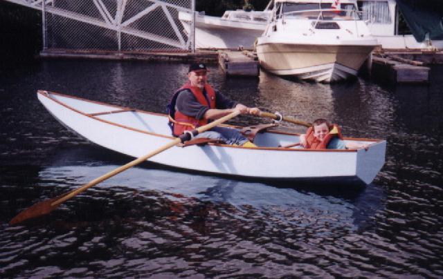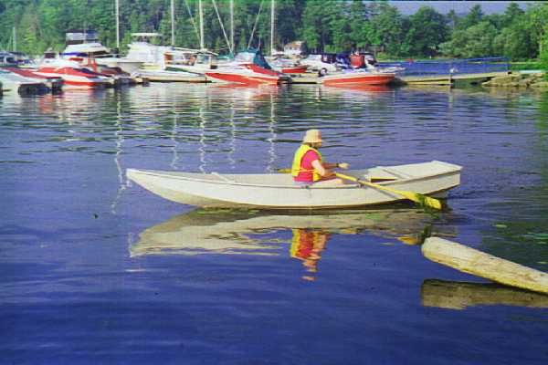 The new shape makes a different sound - a "swish, gurgle" as it cleaves the water, where the original Roar has a "tap, tap" sound typical of boats that go over the water instead of through it. I suspect the original shape is slightly faster in smooth water but the new bow has the edge everywhere else. She'll row at 4-1/2 mph with medium effort using the 7 foot oars detailed in the plans. Adding a passenger to either version will hardly slow her, although acceleration and deceleration are affected.