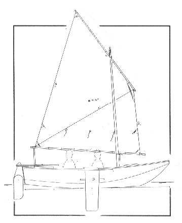 The balanced lug rig sets on short spars and sails very well reefed, in fact can be set up with jiffy reefing. The spars are all short and easily made and stowed, the mast being but 14.5' long and setting 97 square feet of sail. In addition there are oar ports for those with lots of time and little money and a motor well for those with lots of money and little time. Two horsepower is all that a boat like this can absorb without going crazy. The motor well is actually an open self draining well that uses the full width and depth of the stern. It will come in handy for storing the wet and muddy things you don't want inside the boat, like anchors and boots. I've suggested in the plans that the rudder can be offset to one side a bit to give more room for the motor. both Petesboat and Frolic2 have used an offset rudder with no harm other than perhaps needing a curved tiller to make it more comfortable. In the case of Petesboat the 60hp motor was on centerline and the rudder way over yonder to one side with linkage to a centerline tiller. Pete said the large rudder offset had no effect on steering.
