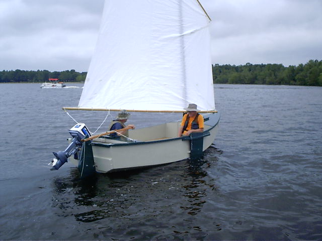 We agreed there that I should have drawn the mast taller but she was otherwise right on. We had no strong wind that weekend so we don't know yet how she would handle that but this shape hull is about the best I can draw for rough water. She is big and roomy inside...