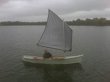 This is Ted Arkey's Jukebox2 down in Sydney. Shown with the "ketchooner" rig, featuring his own polytarp sails, that is shown on the plans. Should have a sailing report soon.