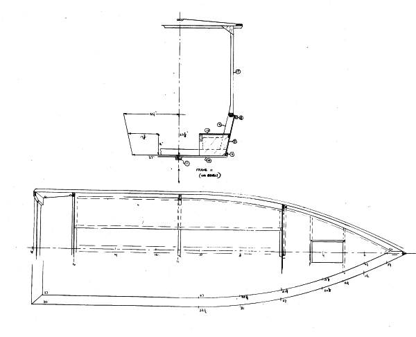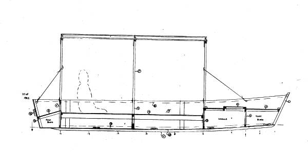 This sort of shape has some advantages beyond the simple setup. Because the hull is constant aft of the middle a fellow could lengthen, shorten very easily. You can't make it wider or narrower easily. In addition, the bench seats are I think pretty much nonstructural. You could omit them leaving the center open except for the center frame. Sit on a folding chair like I do with my AF4. Unfortunately I do think the center frame is needed to keep flexing of the bottom under control. But there are other ways around that, for example using a deeper center shoe. The bottom, as shown, is a copy of what I use on my AF4 now with satisfaction. 1/2" plywood with a 2x4 center shoe full length. Max Wawrzyniak showed me the way on this after my first AF4 bottom proved flexible beyond enjoyment. It is a very simple build indeed.
