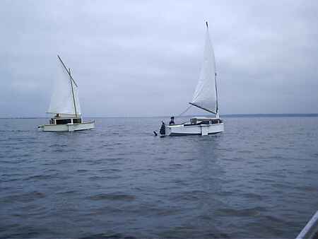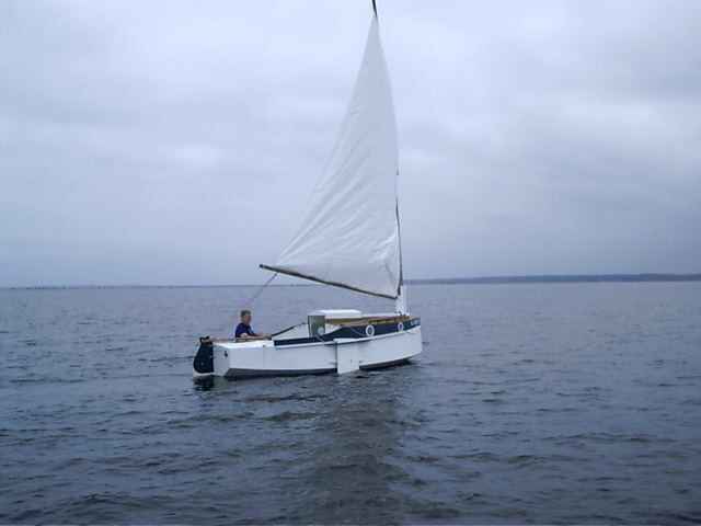 This is Ted Arkey's Jukebox2 down in Sydney. Shown with the "ketchooner" rig, featuring his own polytarp sails, that is shown on the plans. Should have a sailing report soon.