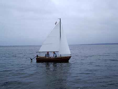 The polytarp sail was smooth, and required only a bit of tuning to hold a near-perfect shape. Handling the rigging was typical for a gaff-rigged boat, meaning more complicated than a balanced lug, but only during the initial tuning process. Lazy jacks were added the second day to keep the sail out of the cockpit.