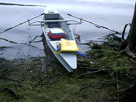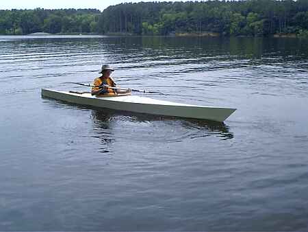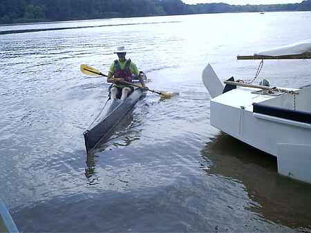 I gave it a whirl. The outrigger actually worked well but I had the impression it needed longer oars to make it fly. At 3 or 4 mph there was little wake but I couldn't go faster because of oar gearing, sort of like using a good bike stuck in its lowest gear. It has possiblities.
