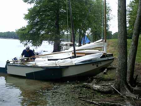 The Fatcat was on its initial wetting, at least in keeping the water out. Mike reported driving through very heavy rain on the way down from Chicagoland and he knew then that the hull did fine in keeping the rainwater in. A good first sail I think. The polytarp sail did wel