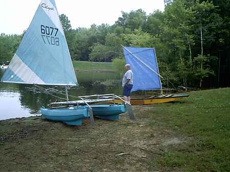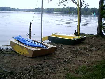 In the background is Steve Lewis with his "Thing" scout canoe. A simple pram shaped canoe that Steve sails. It used to have some training wheel type floats, trimaran fashion, with floats of swimming noodles lashed to plywood plank centers but Steve has graduated from the training wheels. He has other projects at home and maybe next year, who knows what we will bring...