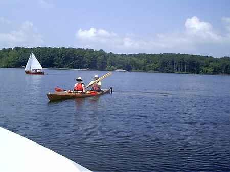 This photo was taken close to where the large cove opens to the main lake and I see that Dave Seaberg had managed to worry his sailing skiff that far. At this time I was in Feller's Philsboat but we at times would cheat with 3hp. While we were out there Jonathan Redfern stopped by for a chat with his kayak (not a CLC but I've forgotten the design). Jonathan is sort of a he-man long distance paddler although he doesn't appear to be a hunky stud type. He is more of a lean marathon runner type and I doubt if he can float on his own. He has completed thousand mile events!