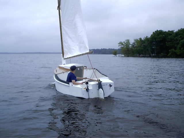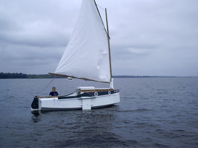 Some moderately brisk winds came up briefly on Sunday morning, and the boat seemed quite speedy in those conditions, although without a GPS I could not measure the speed. I do remember that on Saturday I was slower than the Family Skiff that was out on the lake, but a bit quicker than the Philsboat.