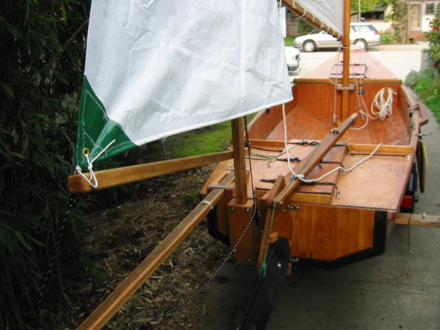 Sail rig is a large but simple 139 square foot balanced lug on an 18' mast. Mast is stepped off center to allow you to walk upright down the slot top and out the front. Should be rigged in an instant with no one going on deck ever. All very low tech built with common materials but effective.