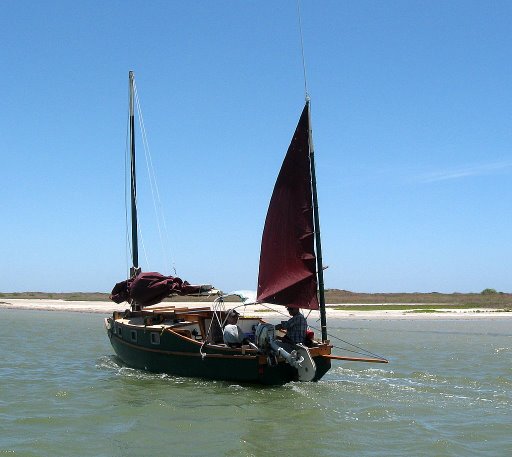 ...OK, here is where the mizzen on the little JInni really payed off. Let's say you are out solo sailing a small light boat in a rising wind that is starting to give you a scare. You want to reef. How are you gonna do it??? You must go forward to drop the main but you can't leave the tiller for a second. If you do she turns sideways and over you go. Even Bolger would say to stick with it and worry your way to shelter, beach and reef. But I found the Jinni would heave to safe with its head to the wind in anything as long as the mizzen is sheeted in tight and the main sheeted loose. Then you can raise the rudder (to keep the boat from swapping ends since it will drift in reverse), go forward to drop the sail, secure a reef, then back to lower the rudder, ease the mizzen and let the boat swing a bit sideways before sheeting in the main and get moving forward. I don't think it could be done any other way. Bolger said it could indeed be a life saver.